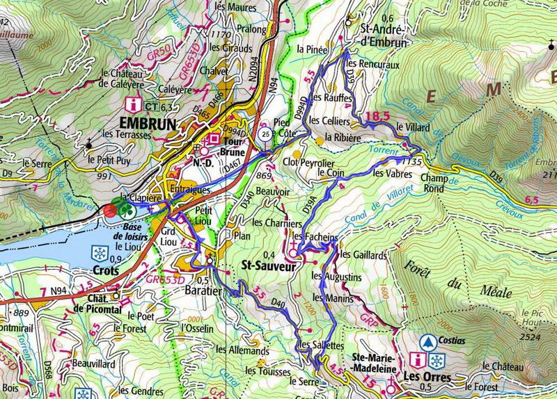 Je rejoins Embrun par les hameaux de Saint-André et la route dominant le torrent de Crévoux, puis la plaine du Roc d'Embrun et la digue de la Durance.